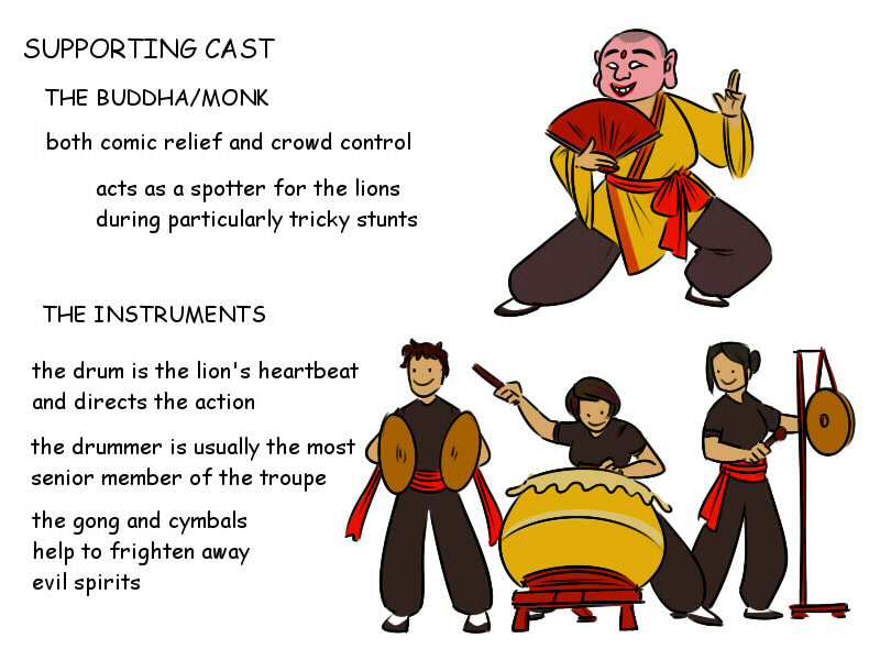 The lion’s head is traditionally constructed using papier-mâché over a bamboo frame covered with gauze, then painted and decorated with fur. The lion consists of two people, where the front person mans the head of the lion and the back person is the tail. The person controlling the head of the lion controls the facial expressions and mannerisms of the lion head. This is created by blink the eyes, moving the ears, flapping the mouth, changing the angles of the head and moving the waist and feet. The tail is used not only to bring life to the back of the lion but also lifts the front person (head) to perform acrobatic tricks.