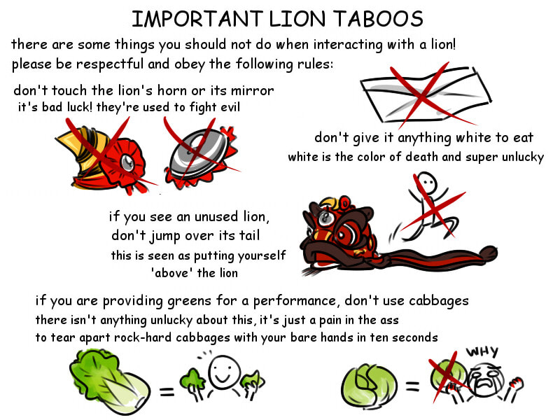 The lion’s head is traditionally constructed using papier-mâché over a bamboo frame covered with gauze, then painted and decorated with fur. The lion consists of two people, where the front person mans the head of the lion and the back person is the tail. The person controlling the head of the lion controls the facial expressions and mannerisms of the lion head. This is created by blink the eyes, moving the ears, flapping the mouth, changing the angles of the head and moving the waist and feet. The tail is used not only to bring life to the back of the lion but also lifts the front person (head) to perform acrobatic tricks.