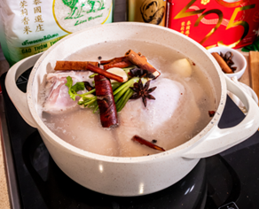 2. Add the chicken pieces and the Chinese herb mix to the pot. If you want, add chicken or duck blood at this stage — this is optional and adds richness.